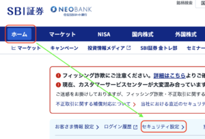 ①画面右上「ホーム」→「セキュリティ設定」をクリックします。