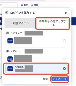 ④登録しているメールアドレスにコードが届きますので入力します。このタイミングで画面右上にパスキーの保存画面がでますので、今ログインしているSBI証券のアカウントを選択し、「既存のものをアップデート」を選択し、「アップデート」をクリックします。